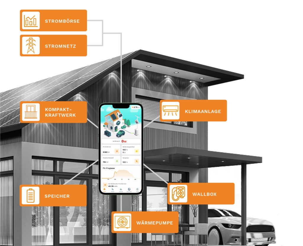 Mit dem SUNHUB, dem Energiemanagementsystem von CALO.SOL, lassen sich Kompaktkraftwerk, Wallbox, Wärmepumpe und andere smarte Geräte intelligent vernetzen. Der SUNHUB berücksichtigt sogar die aktuellen Strommarktpreise und steuert die Geräte so, dass günstige Tarife genutzt werden können – bequem per Smartphone-App.